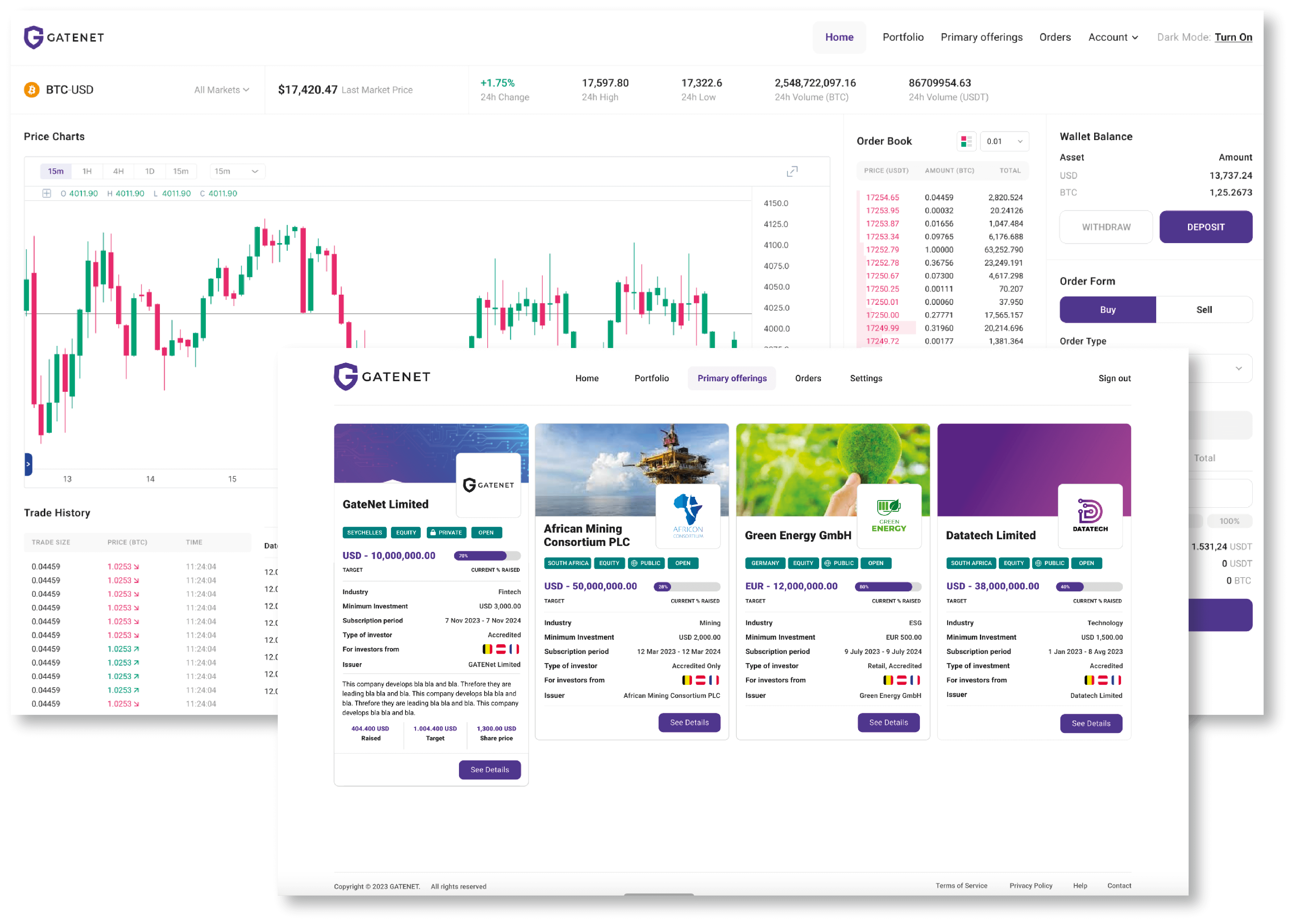 GATENet offers clients a turn-key solution for digital securities & digital assets from Primary issuance to secondary trading, including clearing & settlement finality, meaning when you trade, you settle - T-Instant.
